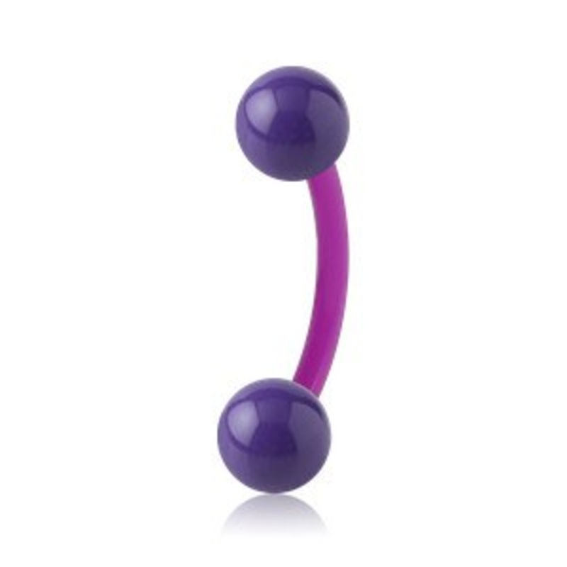 The 16 gauge curved barbell is made from bioflex plastic with external threading. Both 3mm balls are removable and made from enamel coated 316L stainless steel. These cannot be autoclaved. Choose your color below.