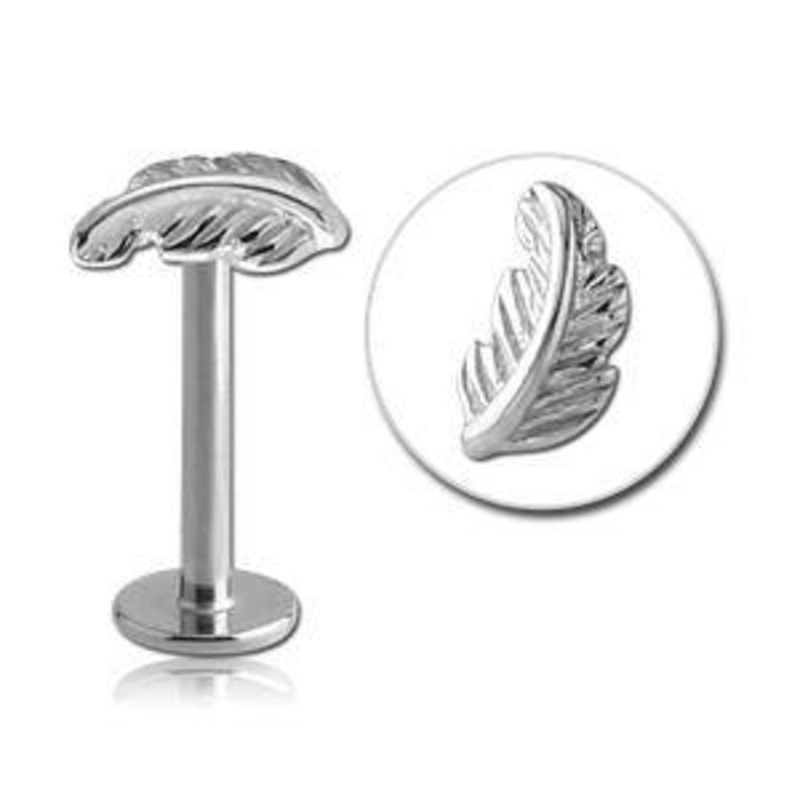 The 16 gauge feather labret is made from 316L stainless steel with external threading.