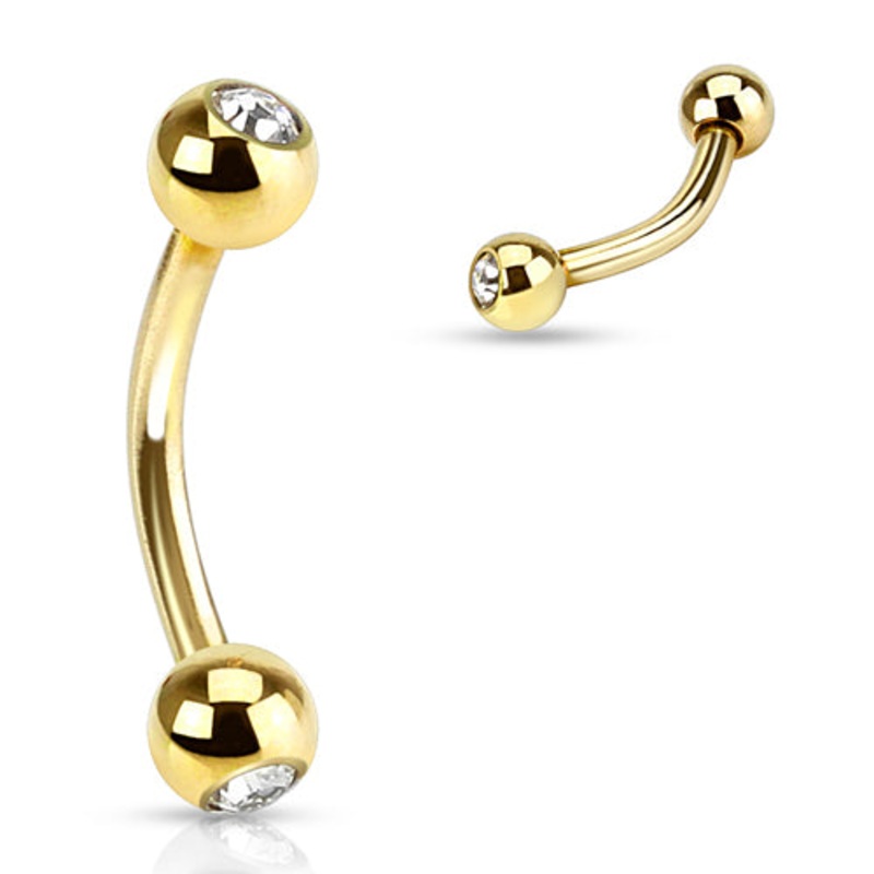 Be the first to review “16g Gold CZ Curved Barbell 16g – 5/16″ long (8mm) – 3mm balls Clear Gold Stainless” Cancel reply