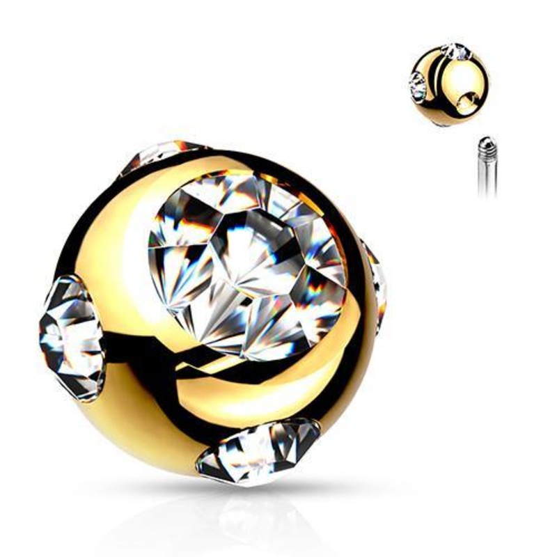 You'll get a two pack of gold PVD coated 316L stainless steel 4mm tiffany gem balls that fit most any 16g externally threaded barbell. Available with clear gems only.
