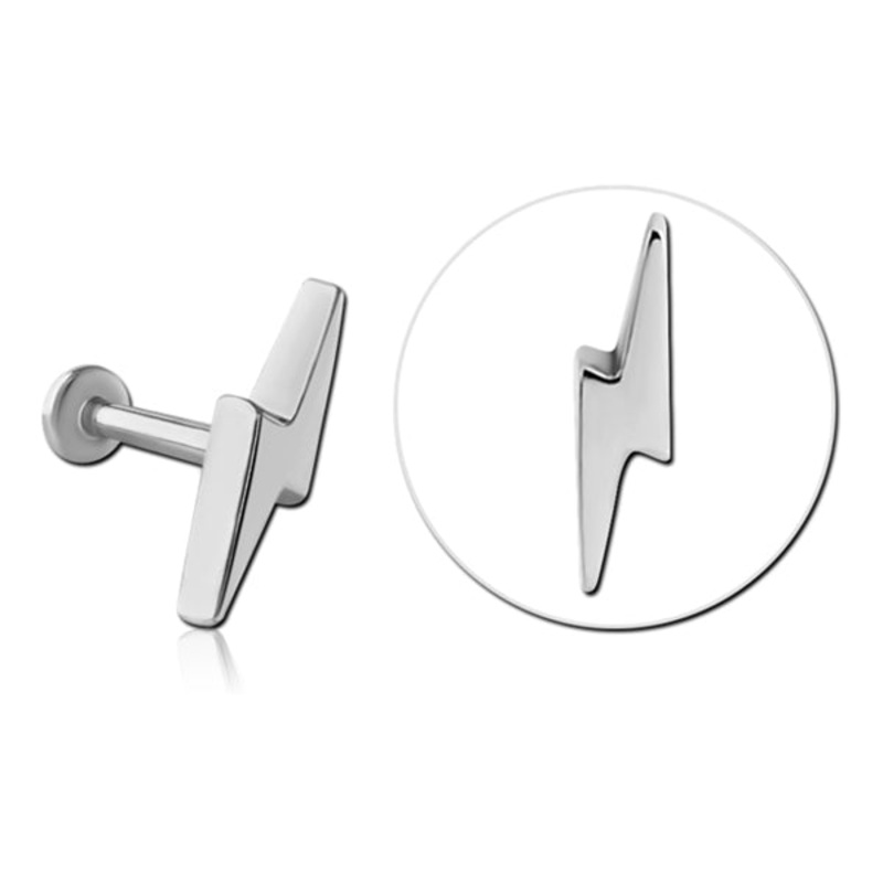 The 16 gauge lightning bolt labret is made from 316L stainless steel with internal threading. The lightning bolt measures 8.8x2.3mm.