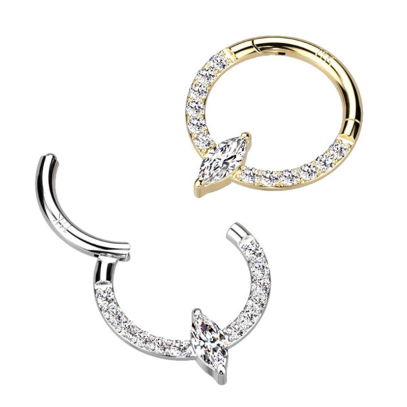 Be the first to review “16g Marquise Center CZ 14k Gold Hinged Ring 16g – 5/16″ diameter (8mm) Clear Yellow 14k Gold”