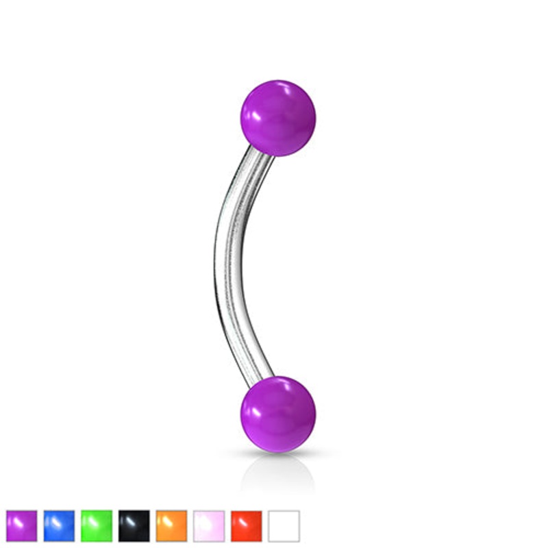 The 16 gauge opaque curved barbell is made from 316L stainless steel with external threading. Both 3mm acrylic balls are removable. Choose your color below.