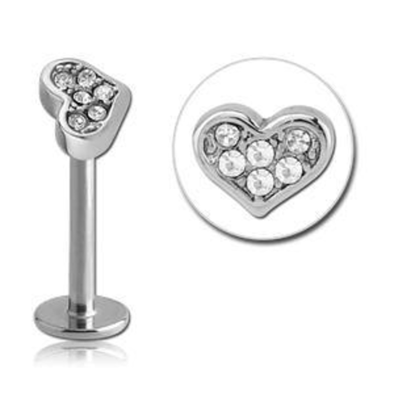 The 16 gauge cz paved heart labret is made from 316L stainless steel with external threading. The gems are available in clear only.