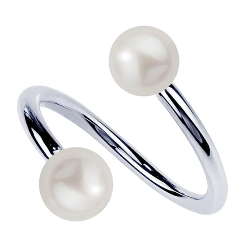 The 16 gauge spiral barbell is made from 316L stainless steel with external threading. Both 3mm synthetic pearl balls are removable. Choose your size below.