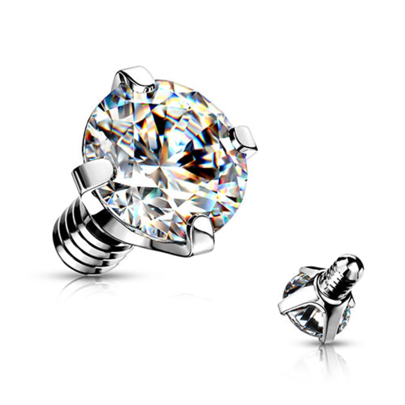 The 16 gauge cz replacement end is made from 316L stainless steel. These will fit most any 16 gauge internally threaded straight barbell or labret. We cannot guarantee compatibility with curved barbells. Choose the size and color of your prong-set faceted gem below.