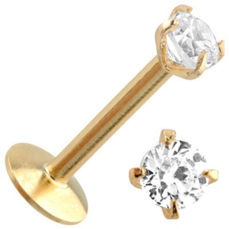 Be the first to review “16g Prong-set CZ Gold Labret 16g – 1/4″ long (6mm) – 2mm cz Clear Gold Stainless” Cancel reply