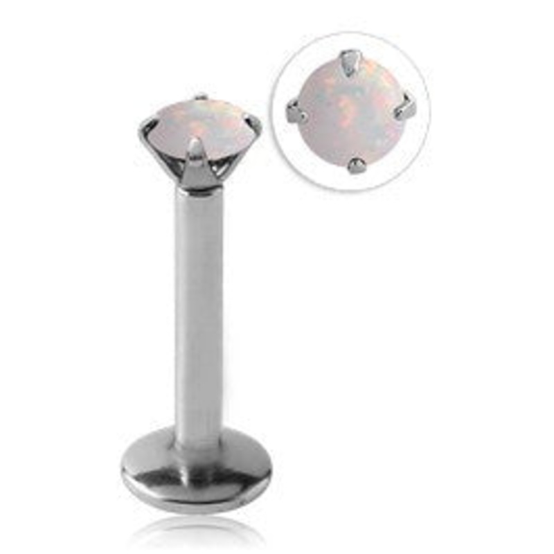 The 16 gauge labret is made from 316L stainless steel with internal threading. Only the 3mm prong-set synthetic opal top is removable. Choose your color below.