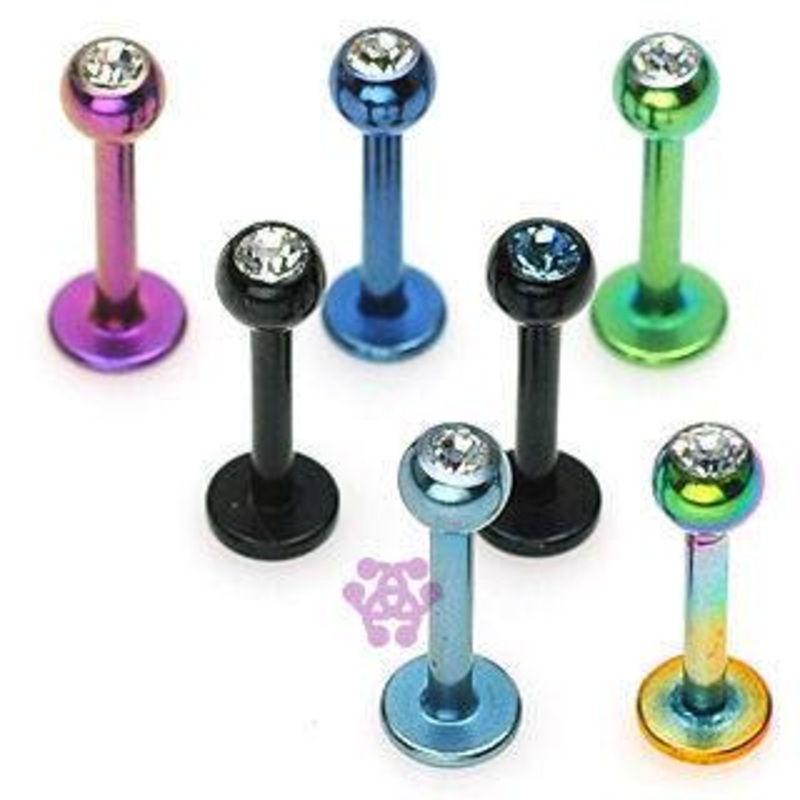The 16 gauge labret is made from PVD coated 316L stainless steel with external threading. Available with clear gems only. Choose your size and color below.