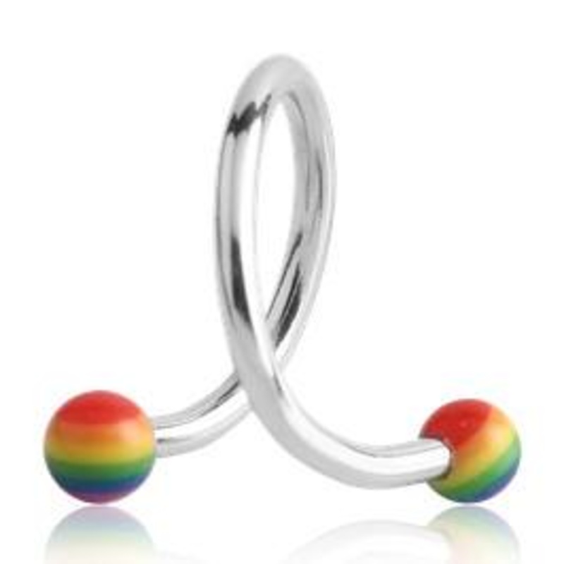 The 16 gauge spiral barbell is made from 316L stainless steel with external threading. Both rainbow acrylic ball ends are removable. Choose your size below.[click here for replacement balls]