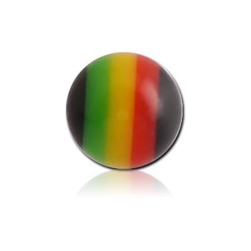 You’ll get a four pack of rasta striped acrylic balls that fit most any 16g externally threaded barbell.