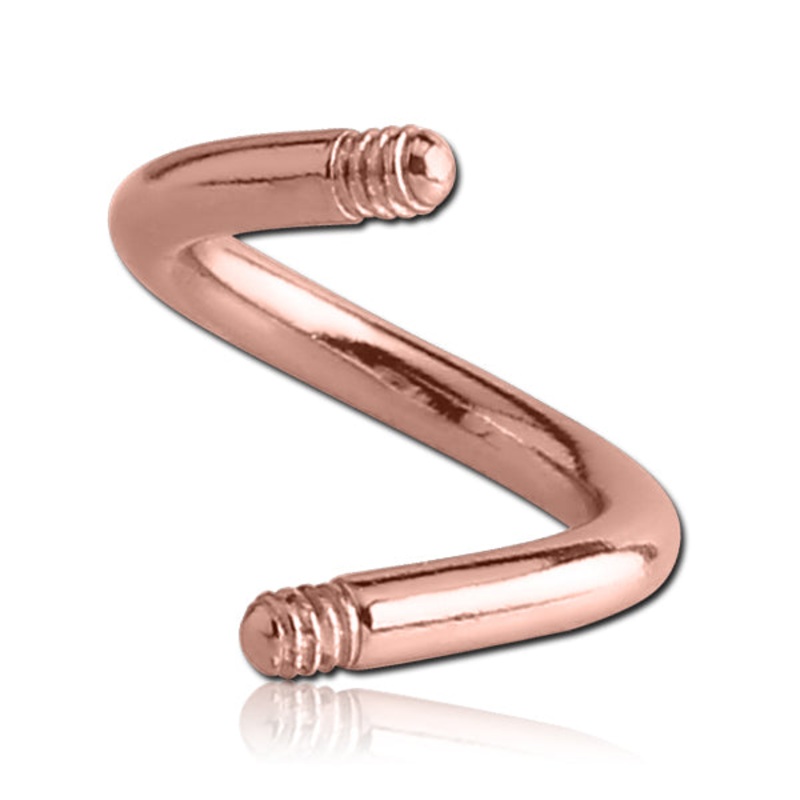 The 16 gauge spiral barbell is made from rose gold PVD coated 316L stainless steel with external threading. You’ll receive two identical barbells without any ends. Choose your size below.