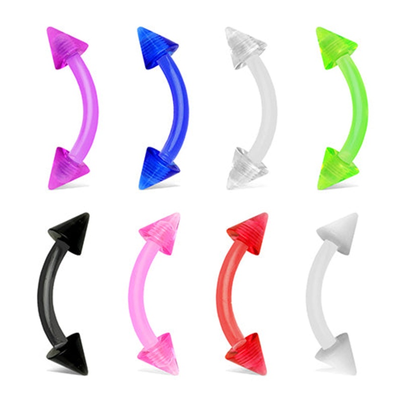 The 16 gauge curved barbell is made from bioflex plastic with external threading. Both 3x3mm acrylic cones are removable. These cannot be autoclaved. Choose your color below.