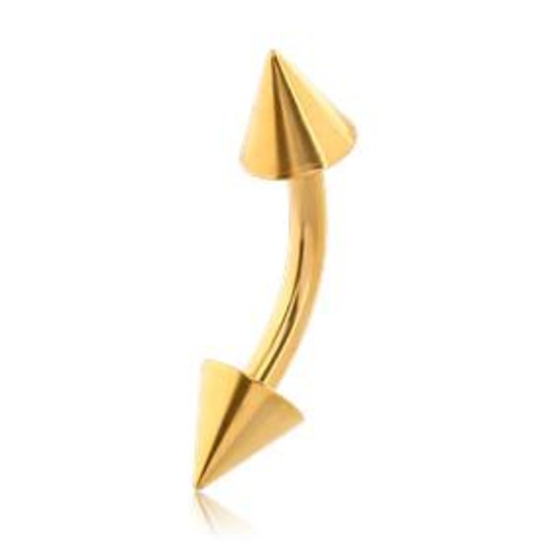 The 16 gauge curved barbell is made from gold PVD coated 316L stainless steel with external threading. Both cones are removable. Choose your size below.