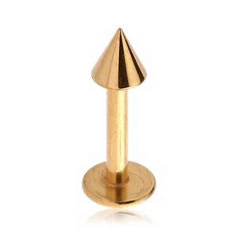 The 16 gauge labret spike is made from gold PVD coated 316L stainless steel with external threading. Only the cone is removable. Choose your size below.