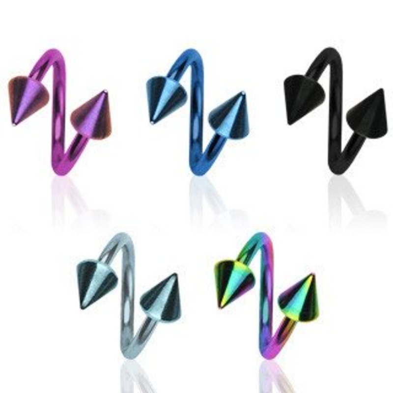 16g Spiked PVD Coated Spiral Barbell 16g – 3/8″ diameter (10mm) – 4x4mm cones Purple
