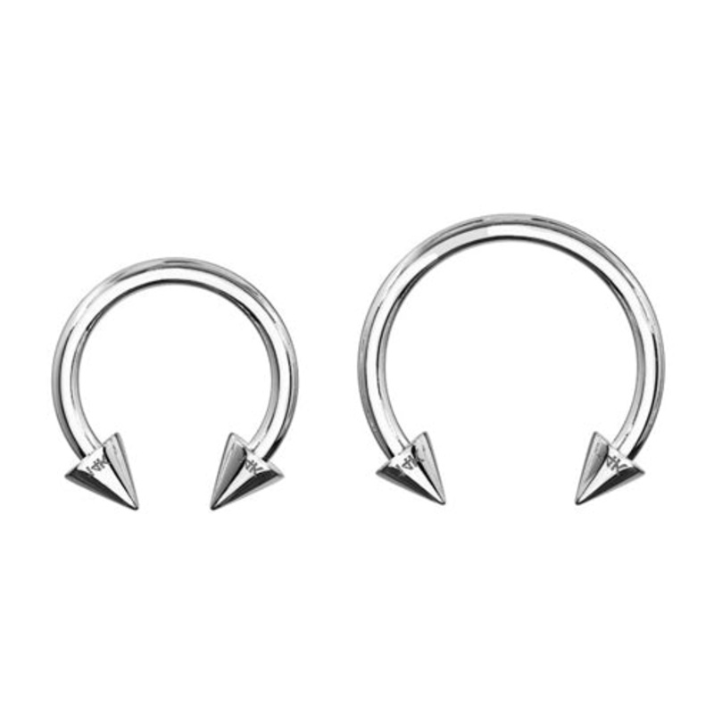 The 16 gauge circular barbell is made from solid white 14k gold with external threading. They're nickel free, hypoallergenic, and polished to a mirror finish. One of the spike ends is permanently fixed to the barbell. Choose your size below.