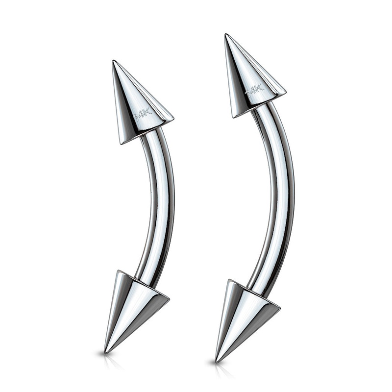 The 16 gauge eyebrow barbell is made from solid white 14k gold with external threading. It's nickel free, hypoallergenic, and polished to a mirror finish. One of the 3x4mm spike ends is permanently fixed to the barbell. Choose your size below.