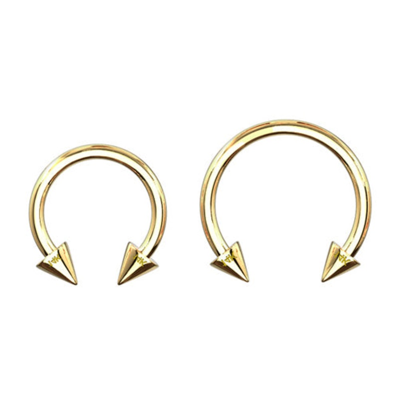 The 16 gauge circular barbell is made from solid yellow 14k gold with external threading. They're nickel free, hypoallergenic, and polished to a mirror finish. One of the spike ends is permanently fixed to the barbell. Choose your size below.