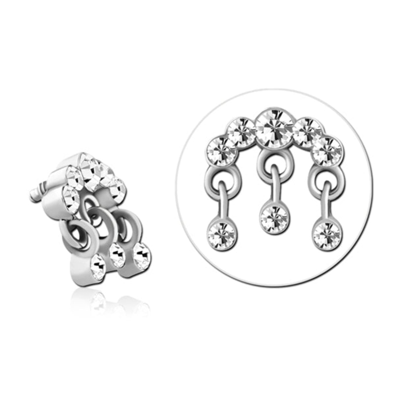 The 16 gauge triple cz dangle end is made from 316L stainless steel. It measures 6mm wide x 9.1mm high. These will fit most any 16 gauge internally threaded straight barbell or labret. We cannot guarantee compatibility with curved barbells. Available in clear only.