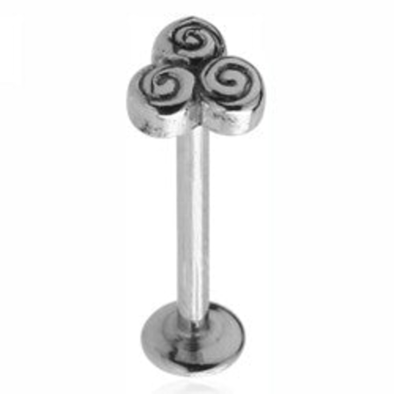 The 16 gauge triskele labret is made from 316L stainless steel with internal threading.