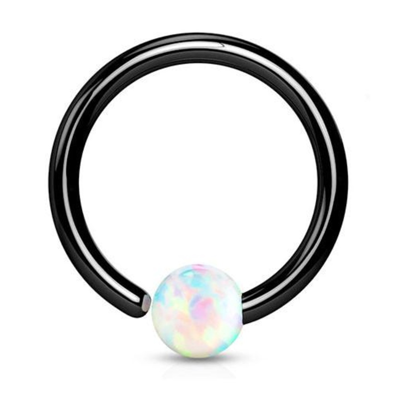 The 18 gauge opal fixed bead ring is made from black PVD coated 316L stainless steel. These have the appearance of a regular captive bead ring except the ball has been permanently fixed to one end of the ring. Do not hold the bead when opening or closing t