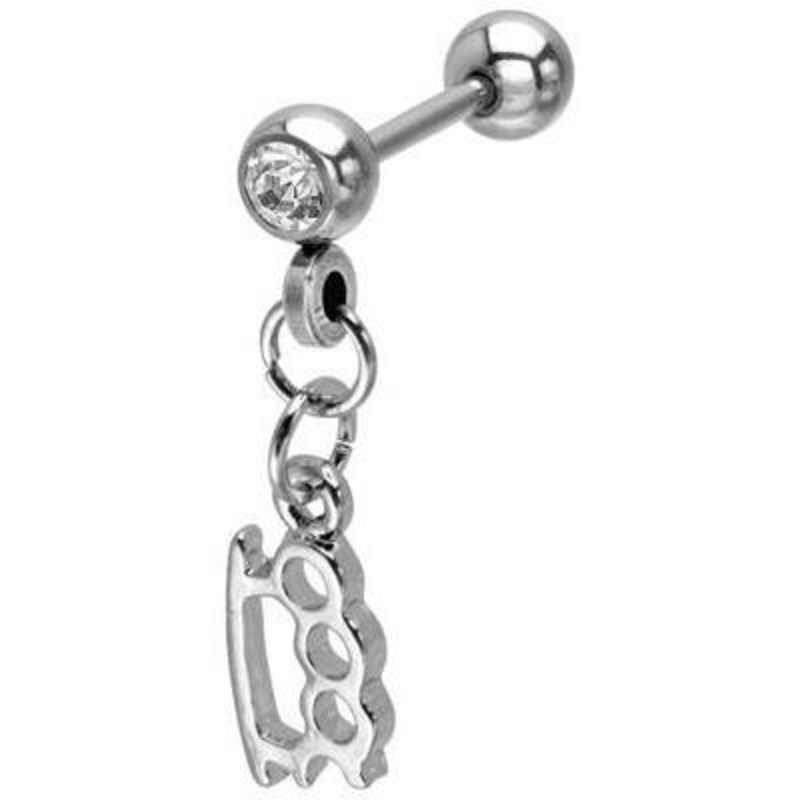 The 18 gauge brass knuckles dangle cartilage barbell is made from externally threaded 316L stainless steel. Only the ball end is removable.