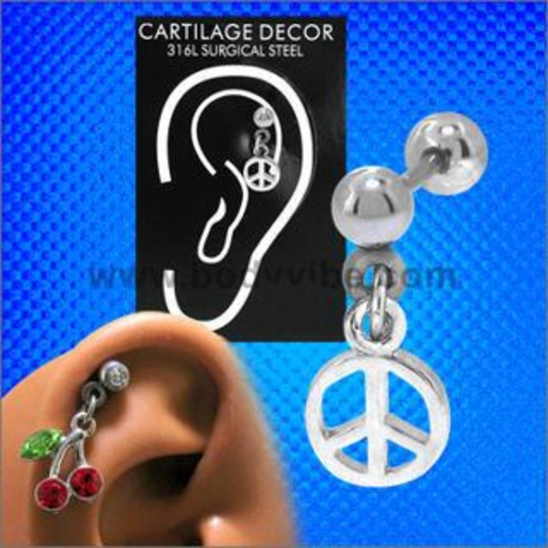 The 18 gauge peace sign dangle cartilage barbell is made from externally threaded 316L stainless steel. Only the ball end is removable.