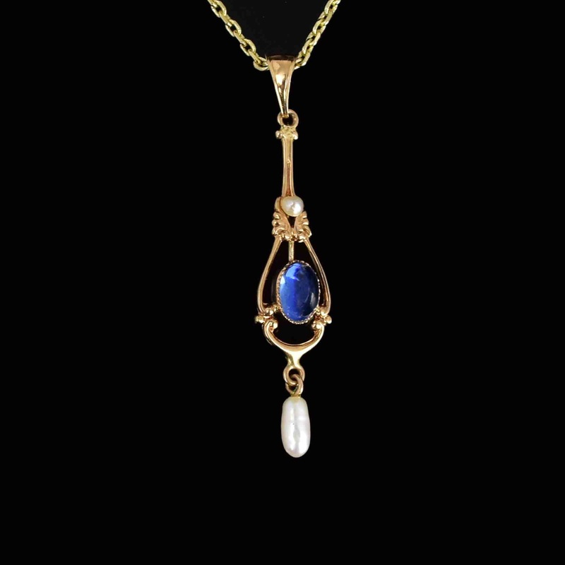Be the first to review “18K Gold Art Nouveau Blue Sapphire Pearl Lavaliere Necklace”