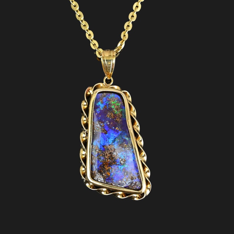 This captivating pendant boasts a stunning Australian boulder opal, encompassing opulent shades of electric blue, purple, and green, nestled in a handcrafted 18K gold braided setting. The free-form cabochon gemstone is securely bezel set within an intricat