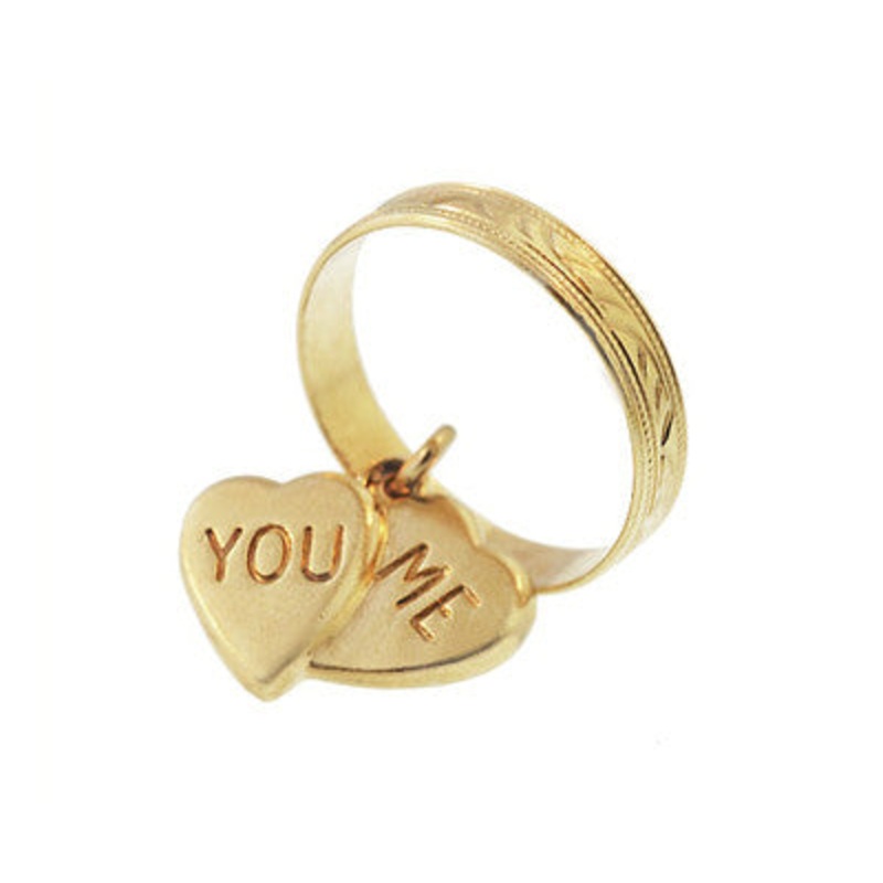 A unique gold heart charm for the one you love, two hearts, one with “YOU” and one with “ME”, dangle freely inside a millgrain engraved circular ring.