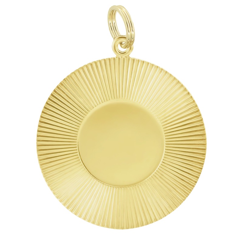 The classic sculptural fluted radiant design catches and reflects light for a show of brilliance, and the high polish flat center of the pendant is the ideal blank canvas for you to personalize…with custom engraving, a gem, or….?