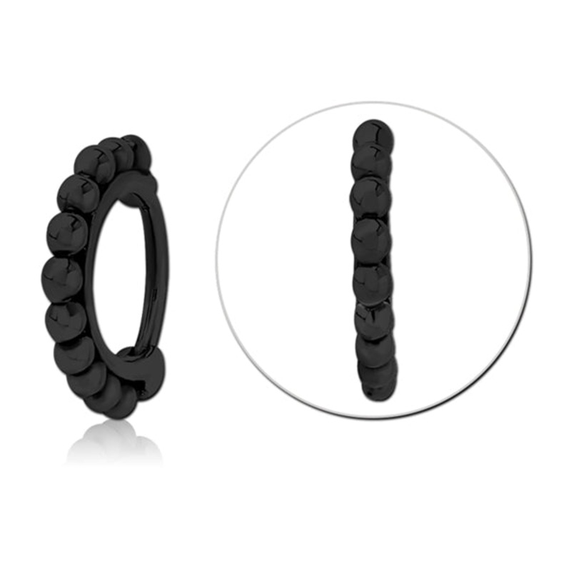 The 20 gauge beaded nostril clicker is made from black PVD coated 316L stainless steel. These are available in 9/32″ diameter only.