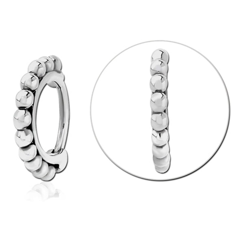 The 20 gauge beaded nostril clicker is made from 316L stainless steel. These are available in 9/32″ diameter only.