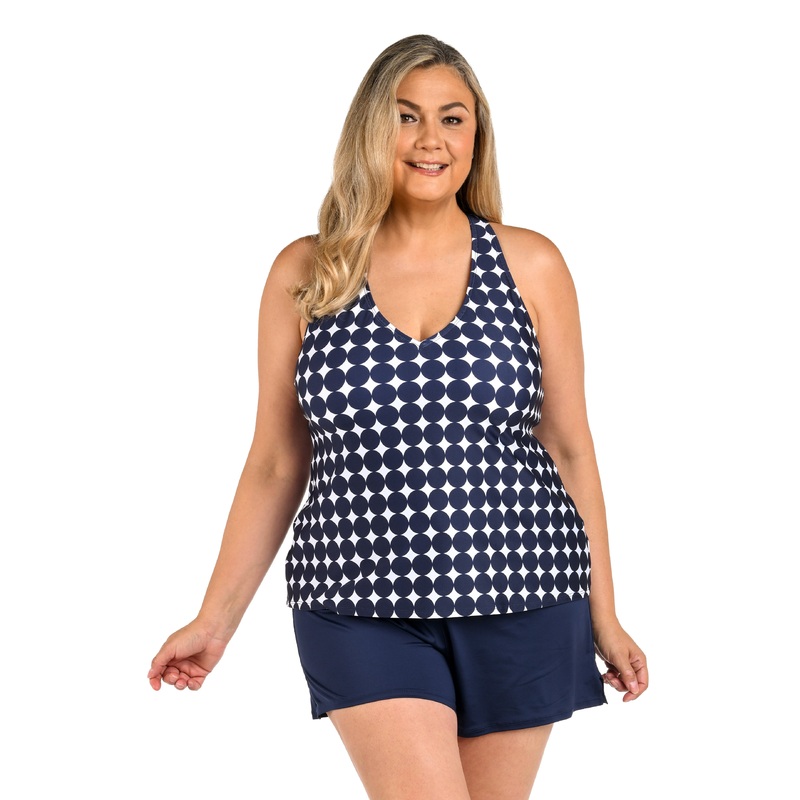 This tankini top features a bold, polka dot pattern in navy and white, creating a striking and retro-inspired look. The semi-sweetheart V-neckline with underwire support makes for a comfortable yet elegant front, whereas the cross-back design enables breathability. Top sold separately.
