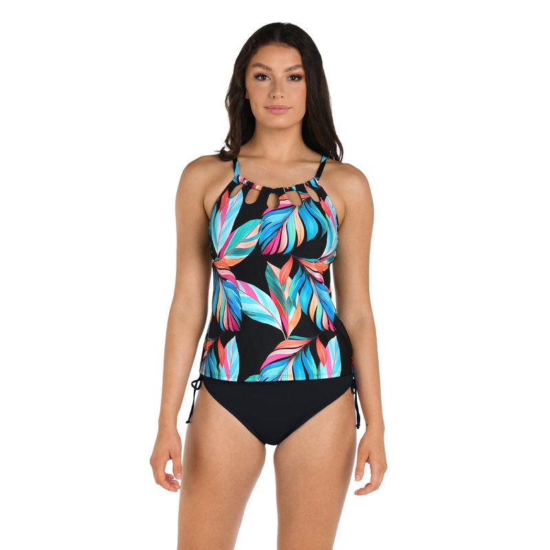 Free ship on orders $79 and up!This tankini top features bold, oversized tropical leaves in vibrant hues of teal, pink, orange, and coral against a deep black background. The stylish high neck with teardrop cutout makes for stylish yet comfortable beachwea