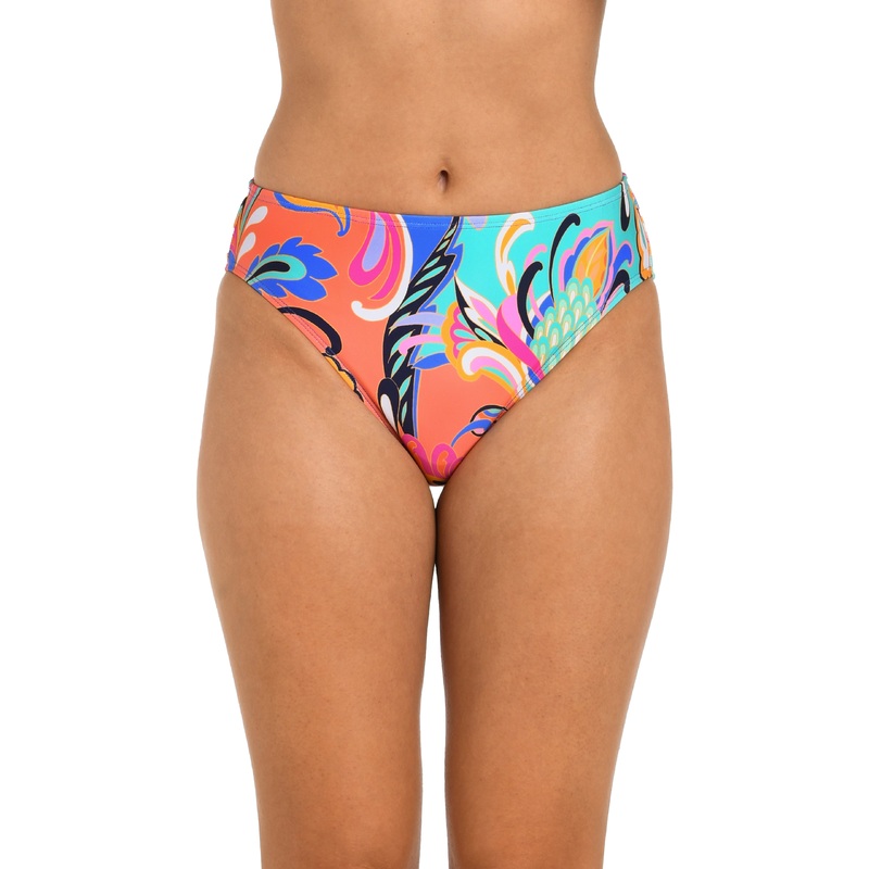This bottom features a vibrant, swirling paisley design in bold shades of orange, pink, teal, and yellow, creating an energetic and eye-catching pattern. The classic hipster fit meets a mid-waist cut and full bottom coverage to keep you in confidence on the beach. Tummy control is included. Bottom sold separately.