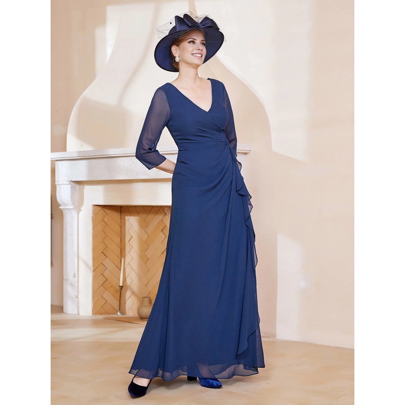 3/4 long sleeved V-neck pleated long mother of the bride dress