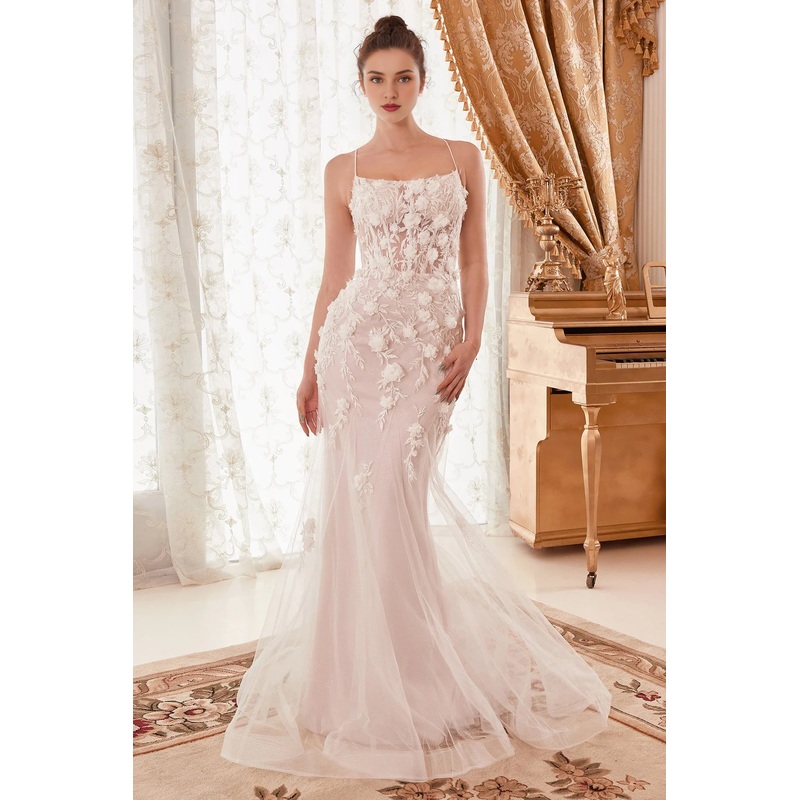 3D floral decal long sleeveless wedding dress