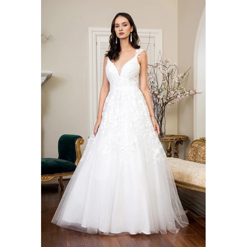 3D floral decal long sleeveless wedding dress