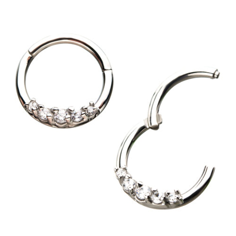 The five clear cz hinged segment ring is made from 316L stainless steel. These look just like a regular segment ring, but so much easier to use (no ring openers are required). Choose your size below.