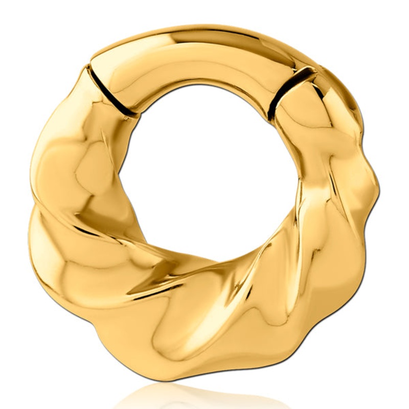 These 6 gauge hinged rings made from gold PVD coated 316L stainless steel.