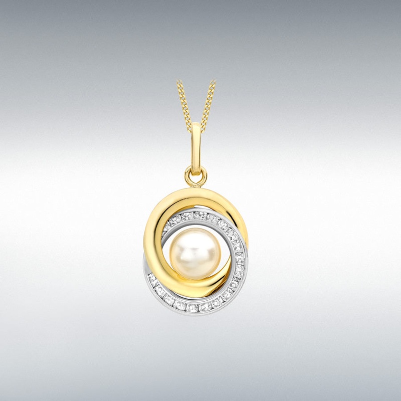 This elegant 9ct two-colour gold pendant features a polished knot design adorned with a lustrous 6mm freshwater pearl and channel-set with 20 sparkling 1mm round white CZ stones. It offers a refined blend of classic and contemporary style, perfect for adding a subtle touch of sophistication to any ensemble.