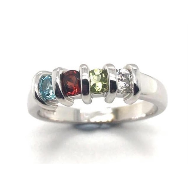 This 9ct white gold ring is set with 4 gemstones representing the birthstones of your children or grandchildren .This ring is made to order. Each ring is unique to each wearer. We can set them order of your choose.