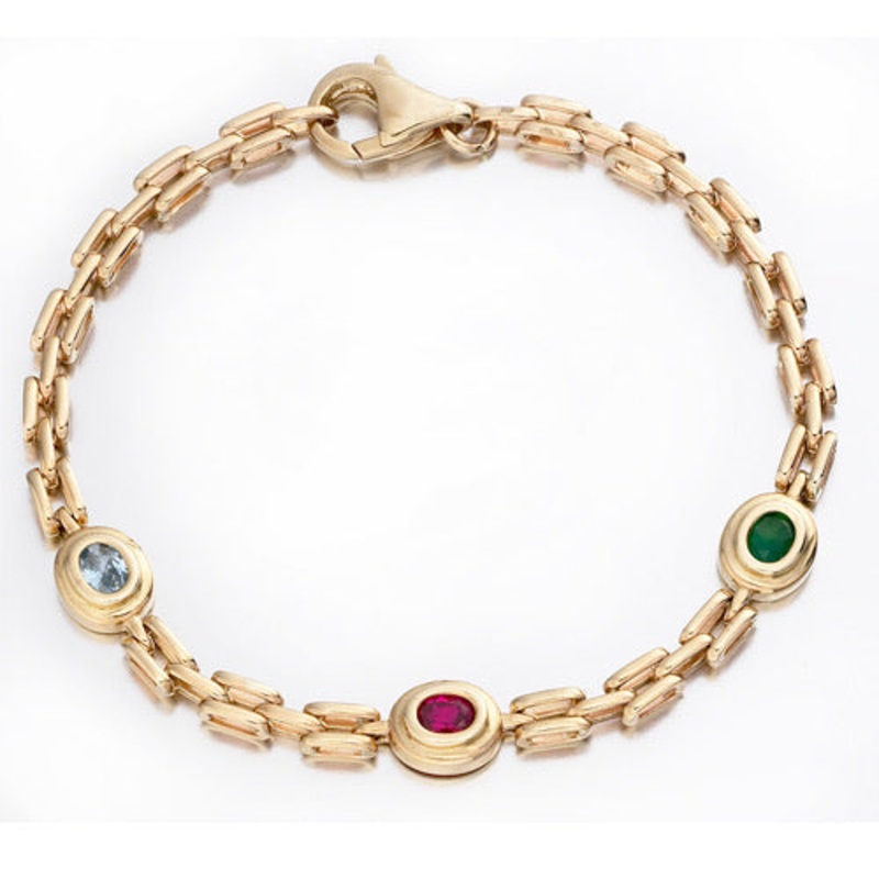 The Mother/family 9ct gold bracelet is set with 3 gemstones. Each one is a birthstone representing the month the child or grandchild was born. A very unique, special and thoughtful family heirloom.