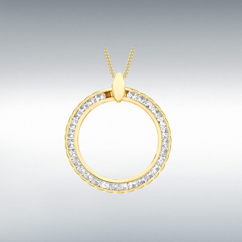 Elevate your style with this elegant 9ct yellow gold pendant featuring a polished finish and a unique cutout-circle design. Measuring 25mm by 22mm, its adorned with 30 sparkling 2mm round white cubic zirconia stones set in a secure channel, adding subtle b
