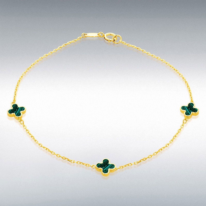 This elegant 9ct yellow gold bracelet features three polished malachite clover petals, each set in secure bezel settings. It offers a delicate yet striking look. The vibrant green malachite stones add a unique touch of nature-inspired beauty, while the spr