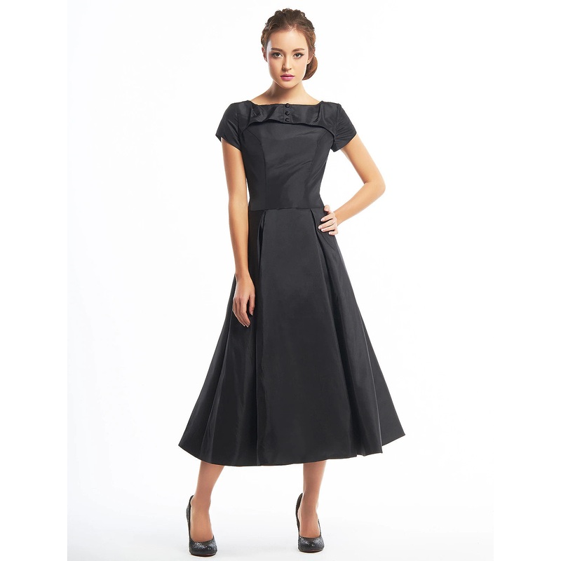 A-Line Black Dress Vintage Homecoming Wedding Guest Tea Length Short Sleeve Boat Neck Taffeta with Buttons