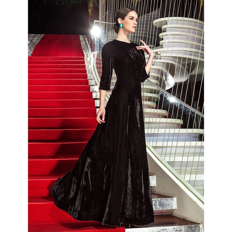 A-Line Black Dress Vintage Wedding Guest Formal Evening Floor Length 3/4 Length Sleeve Jewel Neck with Pleats