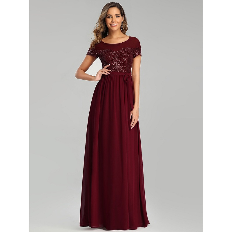 A-Line Bridesmaid Dress Jewel Neck Short Sleeve Elegant Floor Length Chiffon with Sash / Ribbon / Sequin / Sparkle & Shine